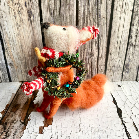 A cute wool fox wearing a festive scarf carrying a wreath. Freestanding decoration.